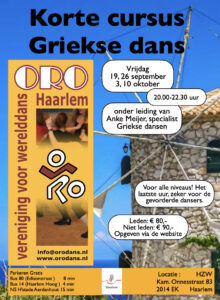 Uit de gesprekken van het bestuur met de leden bleek dat er behoefte was aan een korte cursus. Daarom terug van weggeweest: de korte cursus van 4 vrijdagavonden. Anke Meijer zal ons onderdompelen in de Griekse dansen. Het is (anders dan in het verleden) voor alle niveaus, waarbij steeds het laatste uur op de meer gevorderde dansers is gericht. Anke Meijer zal een programma samenstellen dat doorloopt over alle vier de cursusavonden. Je kunt dus alleen voor de hele cursus aanmelden.